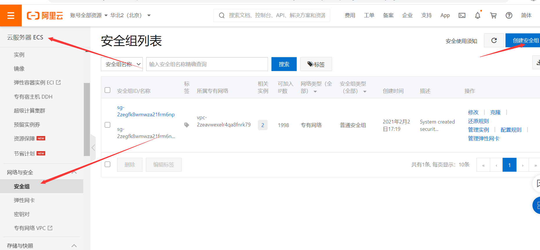 5、阿里云的服务器默认不开放端口号,这样使得我们在网站部署完成之后仍然无法访问。因此我们需要新建安全组并添加 80 端口,再将安全组添加到 ECS 实例中。具体操作如下。在控制台的 ECS 实例中点击安全组,然后新建安全组。