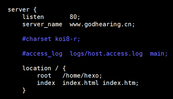 最后将 root 项中的值改为 /home/hexo;,如果 server 中的端口号不是 80,则改为 80。
