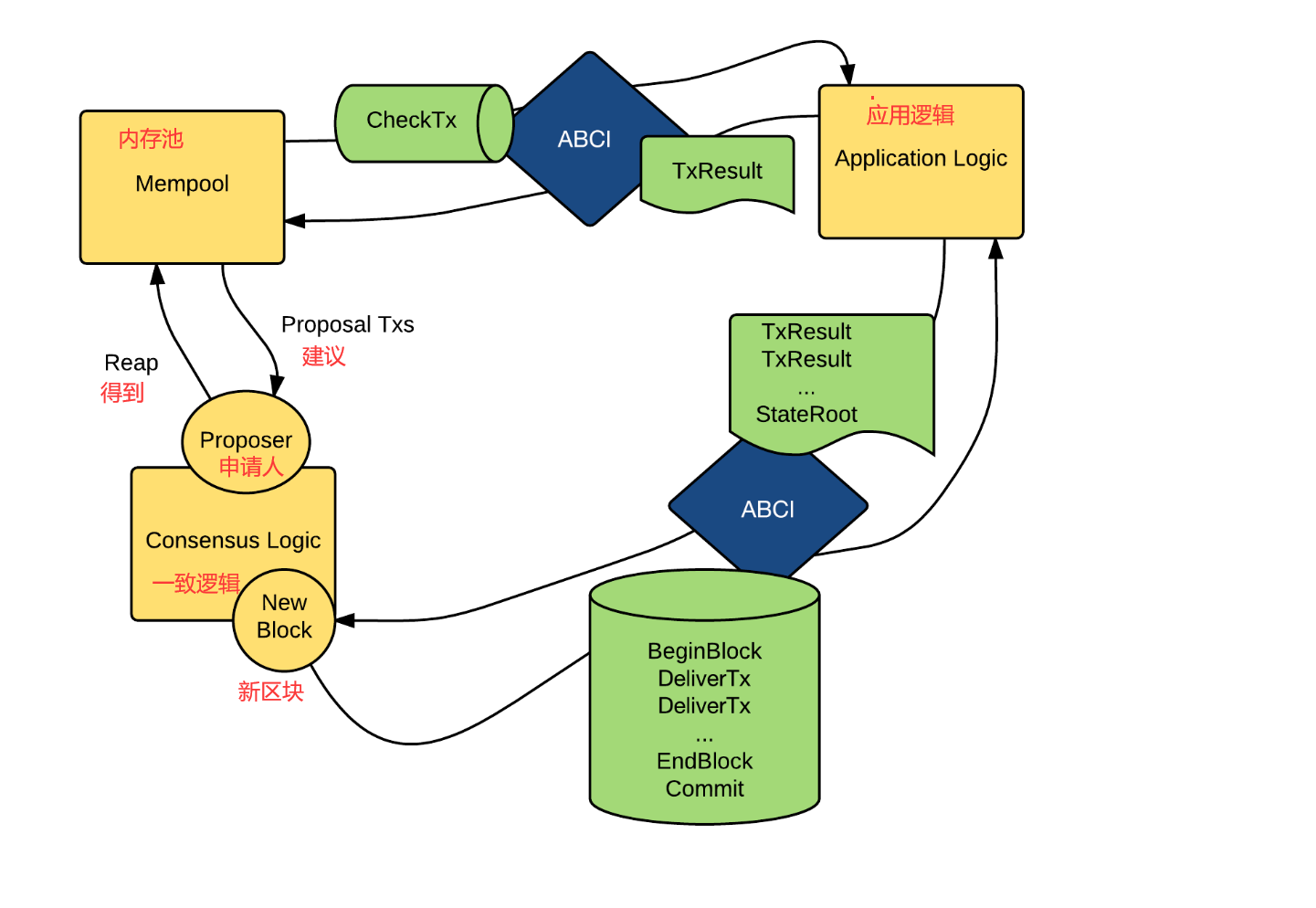 - BeginBlock消息:每当一个新区块开始时,Tendermint节点会发送BeginBlock消息给应用程序,其中包含区块的头信息和交易列表。
