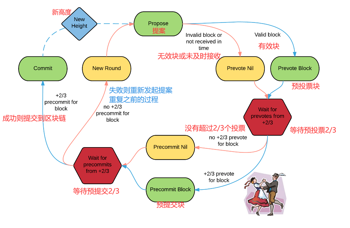 Tendermint是一个易于理解的、主要是异步操作的BFT共识协议。协议遵循一个简单的状态机,如下所示: