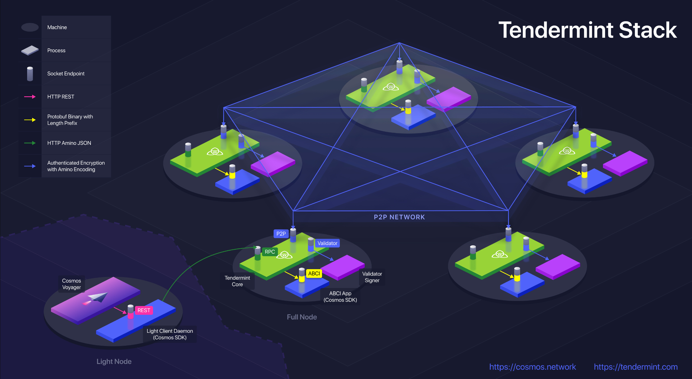 这里的最终用户应用程序是 Cosmos Voyager,在左下角。 Voyager 与本地轻客户端守护进程公开的 REST API 通信。轻客户端守护进程是一个特定于应用程序的程序,它与 Tendermint 节点通信,并通过 Tendermint Core RPC 验证 Tendermint 轻客户端证明。Tendermint Core 处理与一个本地 ABCI 应用程序通信,用户查询或交易实际上是在这个应用程序中处理的。