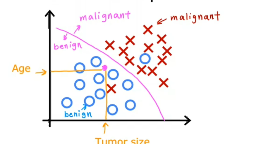 学习算法可能要做的是找到一些边界来区分恶性和良性的肿瘤(粉色的线),因此,学习算法必须决定如何将边界线拟合到这些数据上,学习算法找到的边界线将帮助医生诊断。