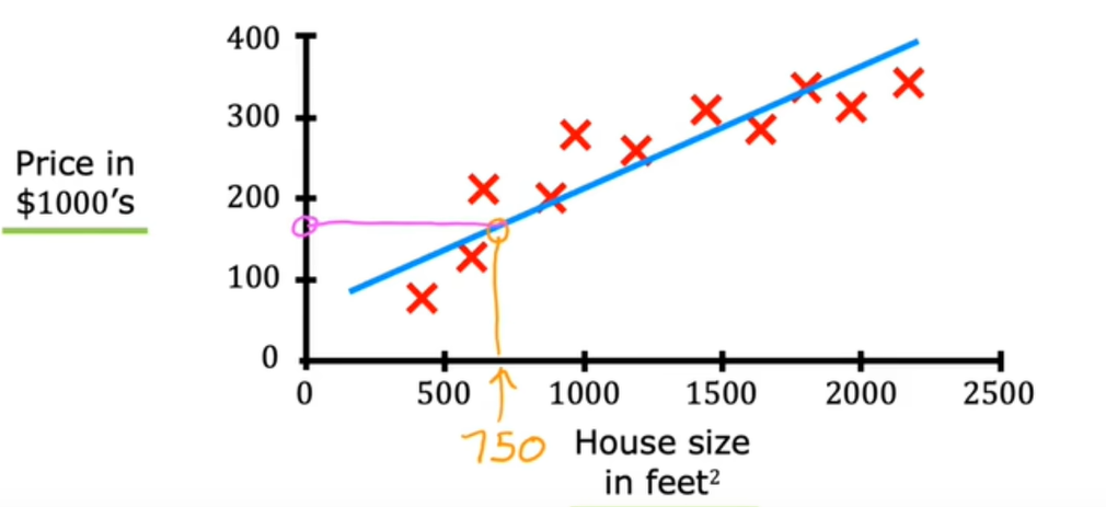 学习算法要做的可能就是绘制一个这样的数据直线,并从直线上读取: