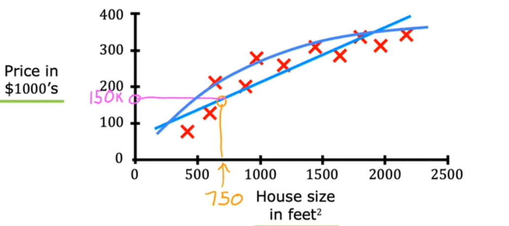 但拟合直线并不是可以使用的唯一学习算法,还有其他可以更好的用于此应用程序的方法,比如,拟合直线时,可能会觉得拟合曲线更好
